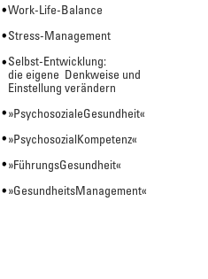 Wir zeigen wegweisende Lösungsmodelle für die Selbst-Entwicklung, »PsychosozialKompetenz« und »FührungsGesundheit« auf und implementieren diese in die Praxis. Wir überzeugen durch Kompetenz und wertorientierte Gestaltung unserer Projekte um eine sinnstiftende Wirkung zu erreichen. Aufgaben die diesen Anspruch nicht gerecht werden, greifen wir nicht auf.