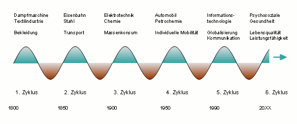 Abb.: Kondratieff-Zyklen mit Basisinnovation und wichtigen Anwendungsfeldern