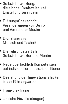 Für Unternehmen und Organisationen wird »FührungsGesundheit« als Kernkompetenz implementiert, die neue Realitäten erkennt und das Denken der Führungskräfte von den materiellen auf die immateriellen Werte verbreitert. Es geht um Verantwortung, Einstellungsänderung und Kompetenzerweiterung. Es geht um gute zwischenmenschliche Beziehungen.
